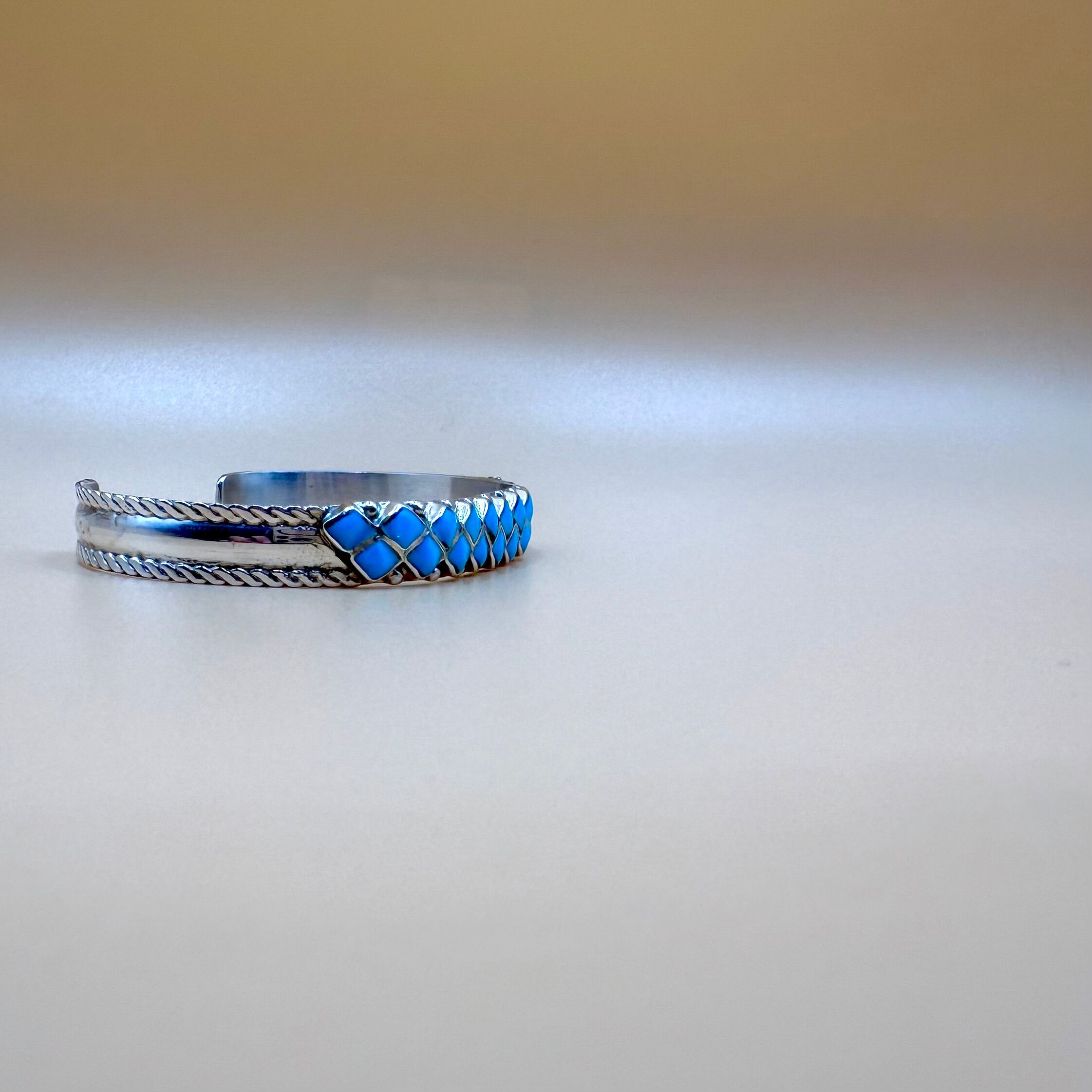 ダイヤ型にカットしたターコイズを並べてインレイワークした可愛らしい仕上がりです